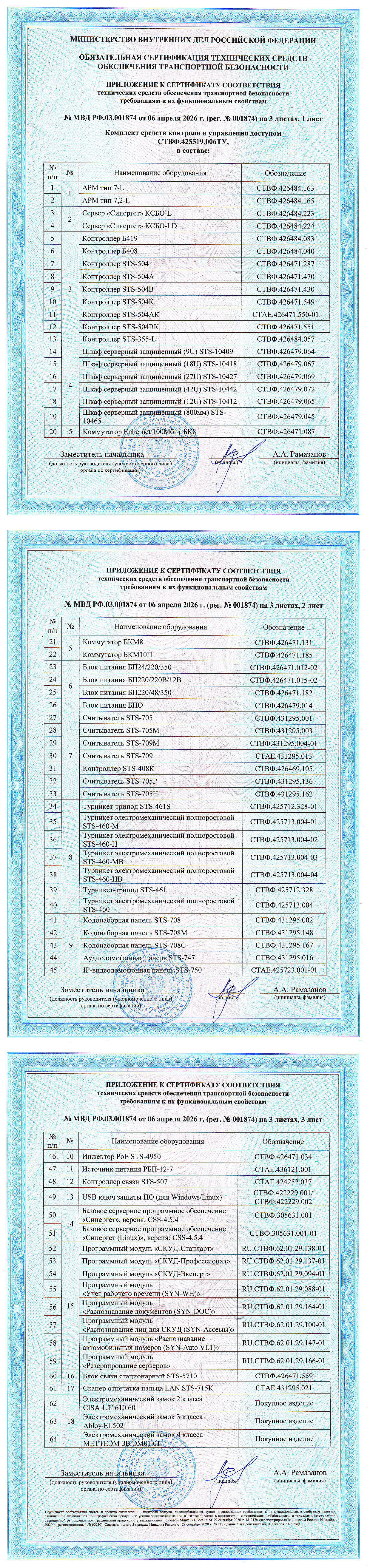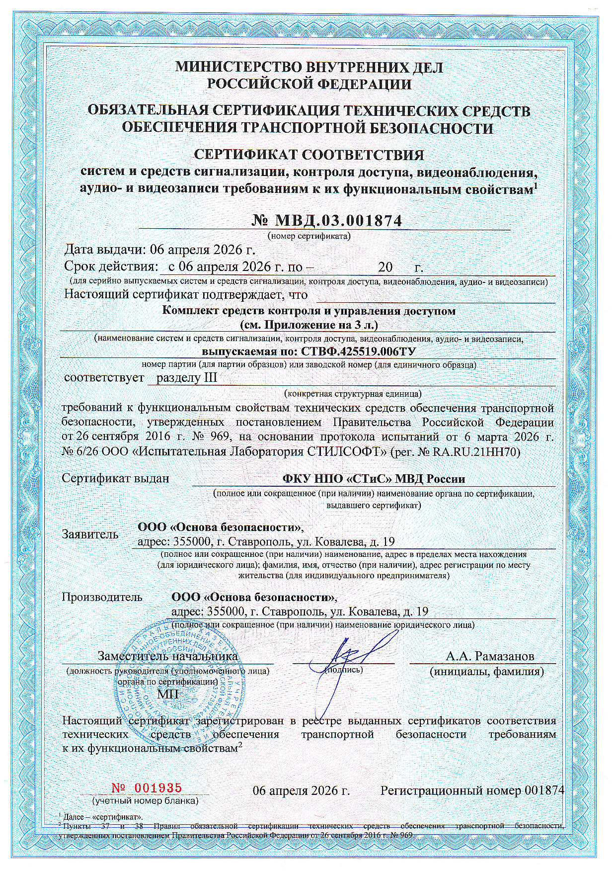 Сертификат соответствия систем и средств сигнализации, контроля доступа, видеонаблюдения, аудио- и видеозаписи требованиям к их функциональным свойствам № МВД.03.001874